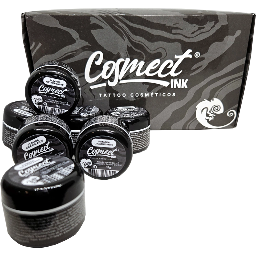 A Pomada Cicatrizante Cosmect Ink® Além de ser utilizada durante o procedimento da tatuagem, para suavizar a entrada das agulhas na pele, também deve ser utilizada após a tattoo como cicatrizante.